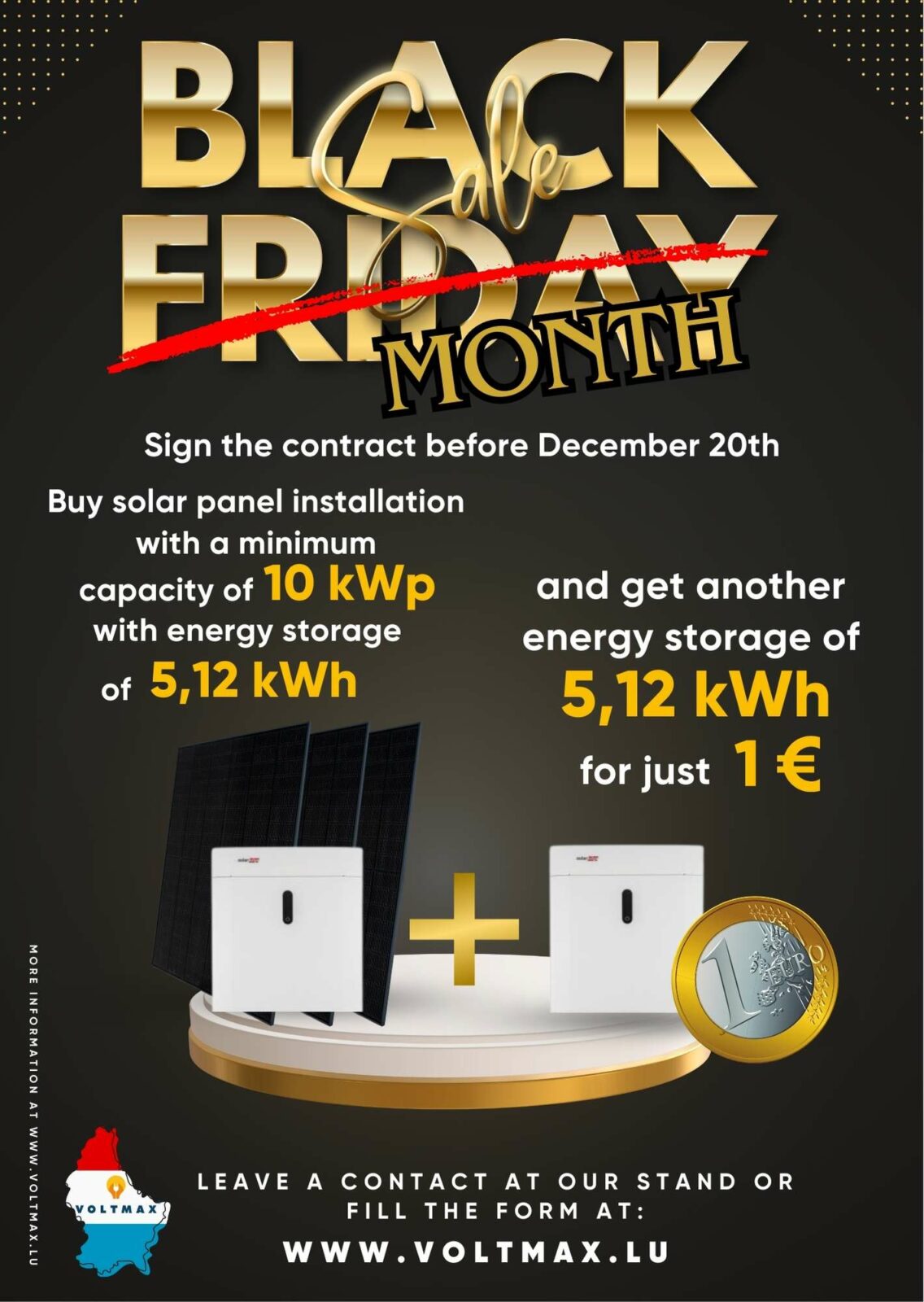 The organizer of the promotion “Additional energy storage module for 1 euro” (hereinafter referred to as the “Promotion”) is Voltmax Sarl with its registered office in Luxembourg, at 47 Rue Mathias Tresch, L-2626 Luxembourg, registered in the Luxembourg Trade and Companies Register (RCS Luxembourg) under number B270450, hereinafter referred to as the “Organizer”.